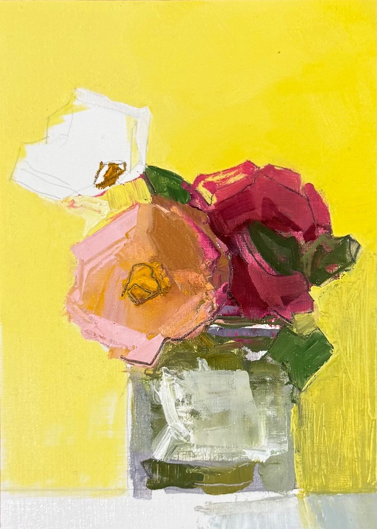 Roses and Glass, Soldoil on hardboard, 6" x 6"Roses and Glass, Sold